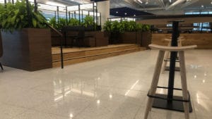 Now came the preparation and it was determined that the concrete access panels had to be ground down to clean concrete to remove all the carpet glue and contaminants. Acoustics ground a test area and I went back to confirm and verify that it was acceptable to receive mortar. After the approval, Acoustics used ARDEX X 78 to install the Uncoupling Membrane ARDEX Flexbone UI 740. They then prefilled areas with ARDEX S 28 and installed the new cement terrazzo pavers with S 28 also. Once installed, ARDEX WA Epoxy Grout and ARDEX SX Silicone were used in accordance with TCNA guidelines for control and expansion joints.