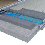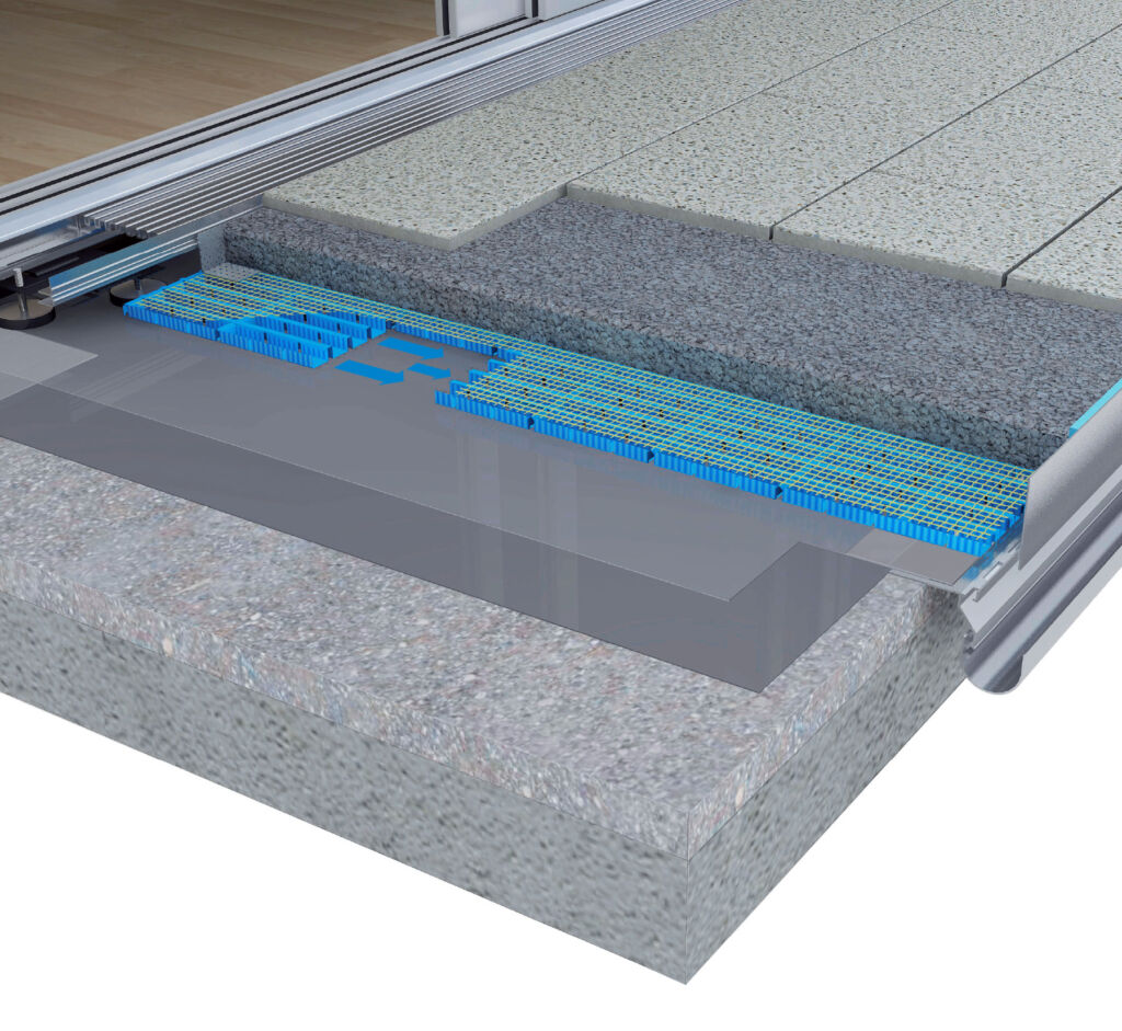 3. La malla de drenaje ARDEX UE 190-8 ProDrain® O la malla de drenaje ARDEX UE 195-10 ProDrain® (solo para bases de grado abierto) se instala sin fijar sobre la membrana impermeabilizante y retardador de vapor ARDEX TLT™.