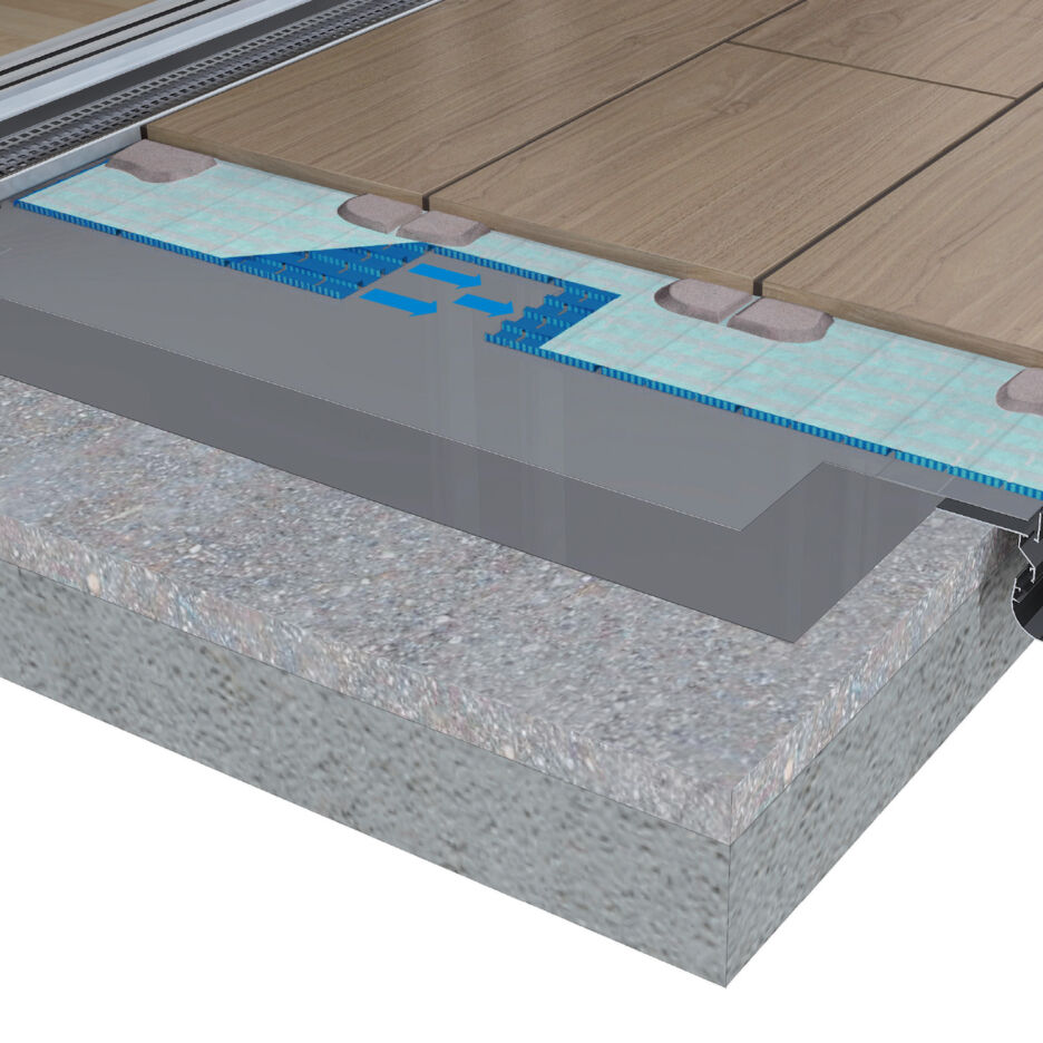 Un sistema de drenaje capilar pasivo completo y probado para la instalación de losetas o adoquines de porcelana de 3/4” (2 cm)+. Ideal donde se requieren requisitos mínimos de elevación de construcción.