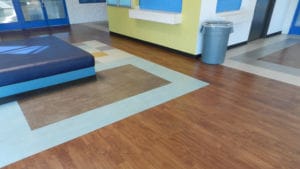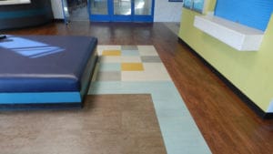 ARDEX Sales Professional Gordon Johnson suggested ARDEX MC™ RAPID which is especially suited to treat areas of new concrete in critical installations, such as health care and institutional applications where the construction schedule does not allow adequate drying of the concrete. ARDEX MC RAPID is also recommended over existing concrete where the level of moisture emissions from the slab exceeds the maximum allowed by the floor covering. After moisture issues were addressed, ARDEX K 15® was poured and controlled around two areas to create a depressed slab for newly installed entry mats. The installer, architect and F.H. Corky Smith representatives were thrilled. To finish the job, Luxury Vinyl Tiles in the Mannington Parallels Series and the Mannington Create Series were used to create a stunning and durable floor.