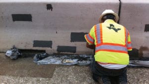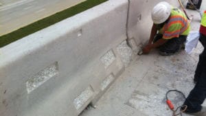 The damaged sections of the vertical concrete barriers were bush hammered and prepared to receive ARDEX B 20™ Overhead & Vertical Repair Mortar, a fast-setting mortar that can be placed from 1/4” to 2” deep in just one lift.